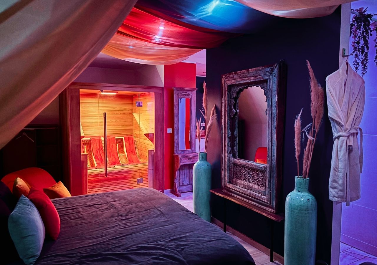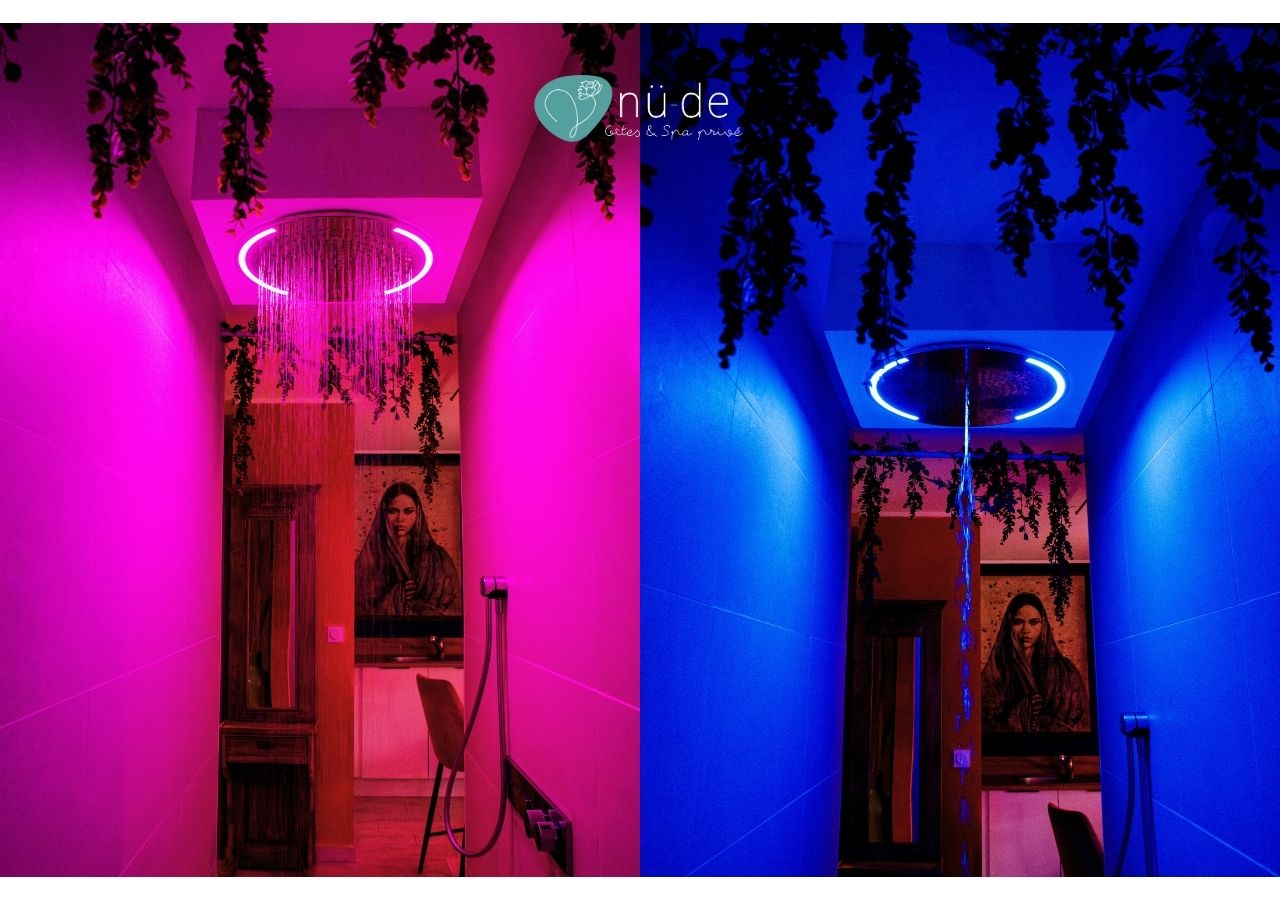 Une douche sensorielle vous permettra de profiter d’un effet pluie tropicale, cascade ou brumisateur (très agréable en sortant du sauna) et de la thérapie par les couleurs. Les petits plus de cette loveroom ?